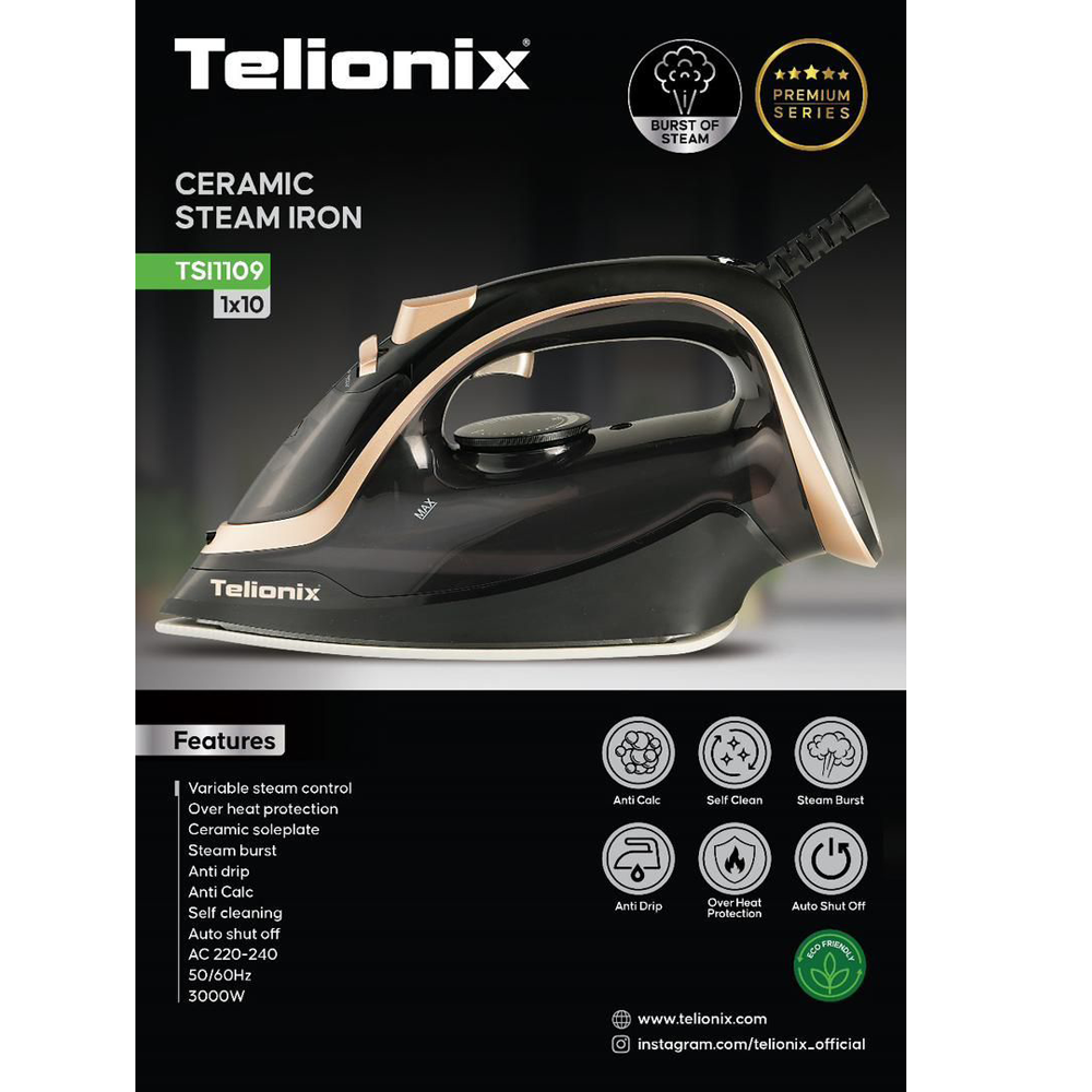 اتو بخار تلیونیکس مدل 1109 با توان بالا 3000 وات و بخاردهی قدرتمند 280 گرم/دقیقه، انتخابی ایدهآل برای صافکردن سریع و حرفهای لباسهاست. کفه نانو سرامیک آن علاوه بر دوام بالا، بهراحتی روی انواع پارچه میلغزد و چروکها را بهسرعت از بین میبرد و مقاومت بالایی در برابر خط و خش دارد و به هیچ عنوان به الیاف لباس نمیچسبد.این مدل با سیستم Self-Clean و ضد رسوب، عمر دستگاه را افزایش داده و نگهداری آن را آسان میکند. همچنین، قابلیت بخاردهی عمودی آن برای صافکردن پرده، لباسهای آویزان و حتی مبلمان کاربرد دارد.این اتو به شما اجازه میدهد تا با بخار قوی، چروکهای عمیق و سرسخت را به راحتی از بین ببرید و لباسی صاف و مرتب داشته باشید.اتو بخار تلیونیکس 1109به سرعت گرم میشود و در عرض چند ثانیه آماده کار است، بنابراین نیازی به انتظار طولانی ندارید.این دستگاه با تنظیمات مختلف بخار، به شما امکان میدهد تا با توجه به نوع پارچه، بخار مناسب را انتخاب کنید و بهترین نتیجه را بگیرید.طراحی خاص این اتو باعث میشود که از چکه بخار در حین استفاده جلوگیری شود و از لک شدن لباسهای شما جلوگیری کند.این دستگاه قابلیت خاموش شدن خودکار هم دارد که اگر بعد از مدت زمان مشخصی اتو جابجا نشود فعال میشود و از سوختن الیاف لباس جلوگیری میکند. حتی در حرارتهای بالا هم مستثنا نیست.بدنه این اتو از مواد با کیفیت و مقاوم ساخته شده است که در برابر حرارت و فشار بسیار بالا، دوام بالایی دارد.