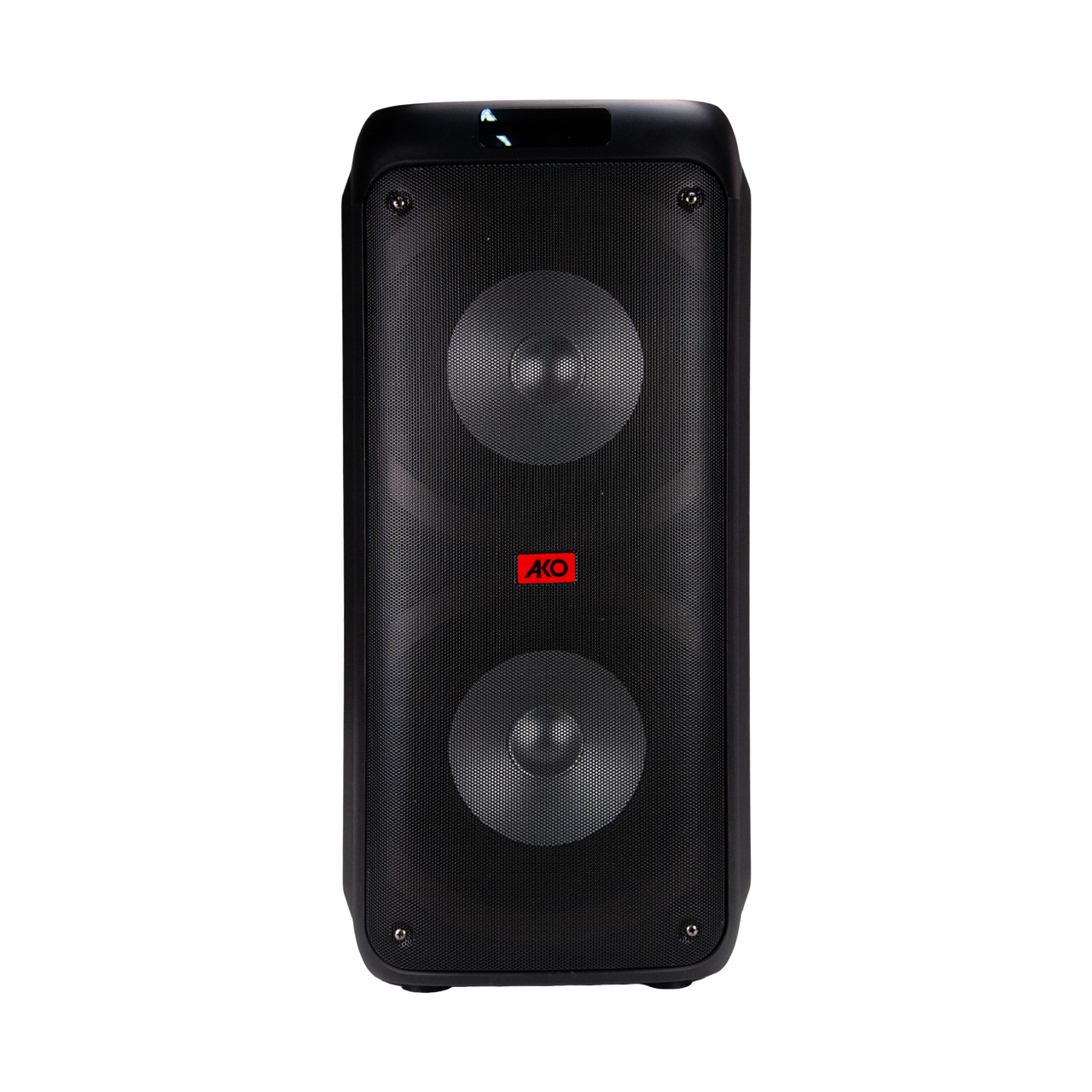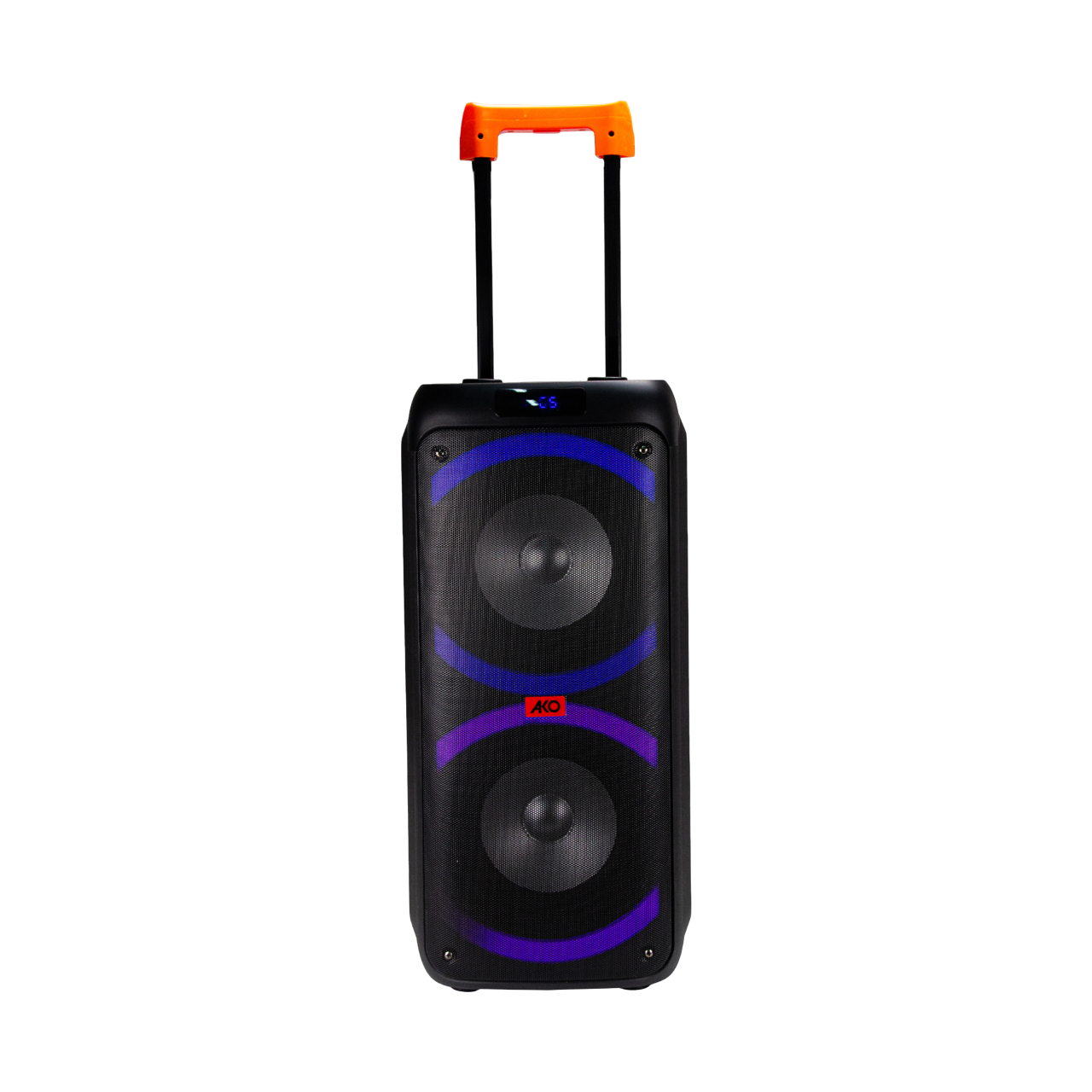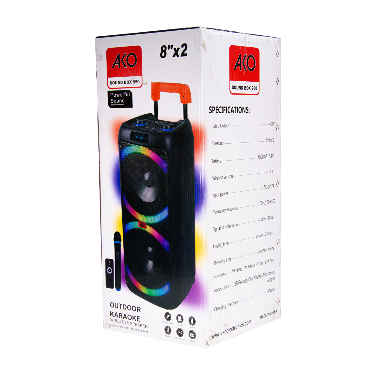 اسپیکر AKO Sound Box 950 — اسپیکر بلوتوثی چمدانی با توان ۶۰ وات، باتری داخلی، اتصال بلوتوث، کارت حافظه، USB، AUX، و رقص نور LED؛ گزینهای عالی برای مهمانیها و استفاده خانگی.
